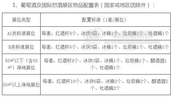 葡萄酒及国际烈酒展区、国际啤酒专区净地展位和标准展位均按下表分别免费配置酒具等相关物品: